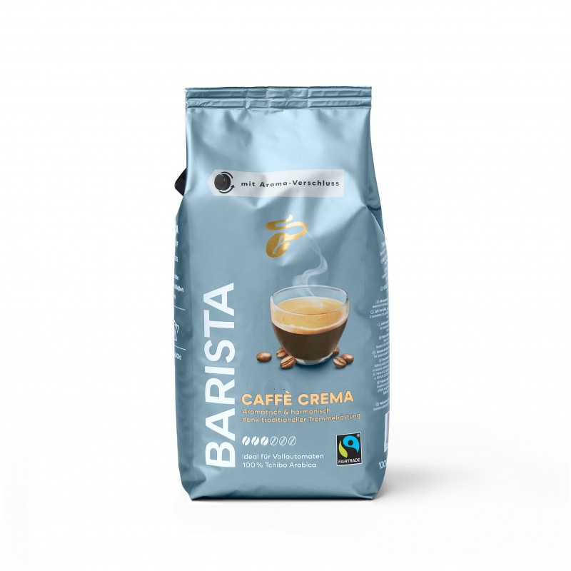 Tchibo Barista Caffé Crema whole bean coffee contains 1 kg of the highest quality 100% Tchibo Arabica for preparing delicious coffee. The package features a closure that preserves fresh aroma. The coffee is suitable for fully automatic coffee machines with built-in grinders, semi-automatic (lever) coffee machines, and coffee pots.